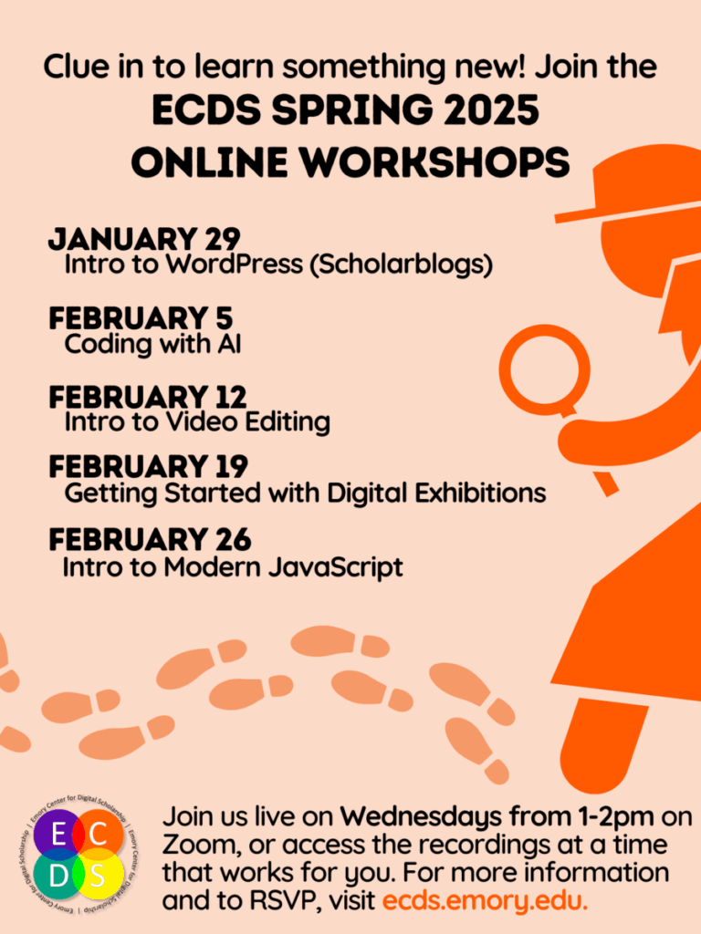 Explore some of our previous workshop offerings in the poster gallery below. Many of our workshops have been recorded and are available to Emory students, faculty, and staff. To access our current collection of recordings and materials, Emory users and affiliates can log in with their NetID here.