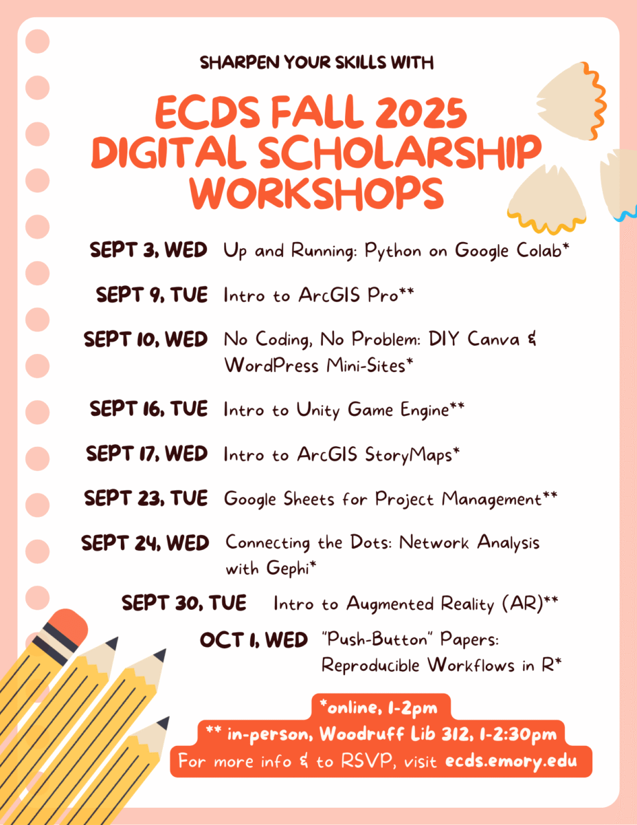 Explore some of our previous workshop offerings in the poster gallery below. Many of our workshops have been recorded and are available to Emory students, faculty, and staff. To access our current collection of recordings and materials, Emory users and affiliates can log in with their NetID here.