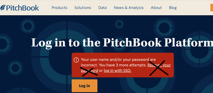 IMPORTANT: Do not use the “Recover your password” or “log in with SSO” options shown in error messages. To properly reset your password through PitchBook: