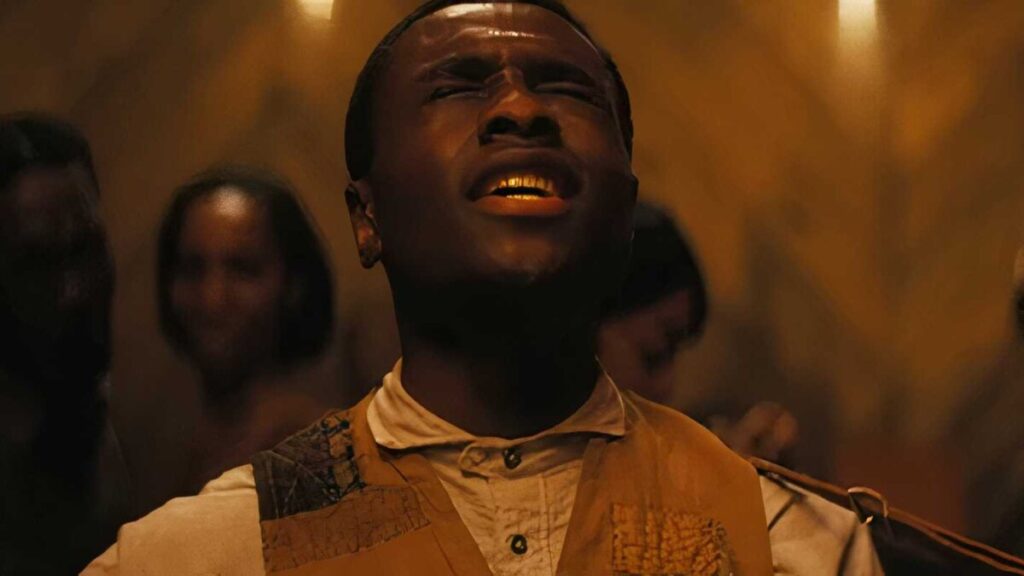 Depth of field describes the “range of distances within which objects can be photographed in sharp focus” (Film Art: An Introduction, 13th Edition). A shallow depth of field, for example, blurs the foreground and the background and keeps the sole subject in focus whereas a deep depth of field allows a larger range of the image to be sharp and in focus. The following scene in Ryan Coogler’s Sinners is a great example of this concept: