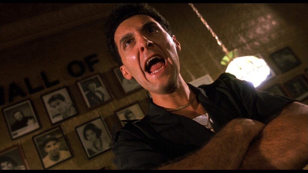 The final technique I’d like to explore is the use of camera angles: the location and/or orientation of the camera relative to the subject. In Spike Lee’s Do The Right Thing, Buggin Out, Radio Raheem, and Smiley barge into Sal’s pizza shop, demanding that Sal put pictures of Black people on his precious “wall of fame” given that most of his clientele is Black. In this scene,Lee uses canted framing (also known as a “Dutch angle”) to disorient the viewer and visually emphasize the tension of the confrontation. Lee also combines these tilted shots with low-angle perspectives to further emphasize the unstable dynamic of the characters.