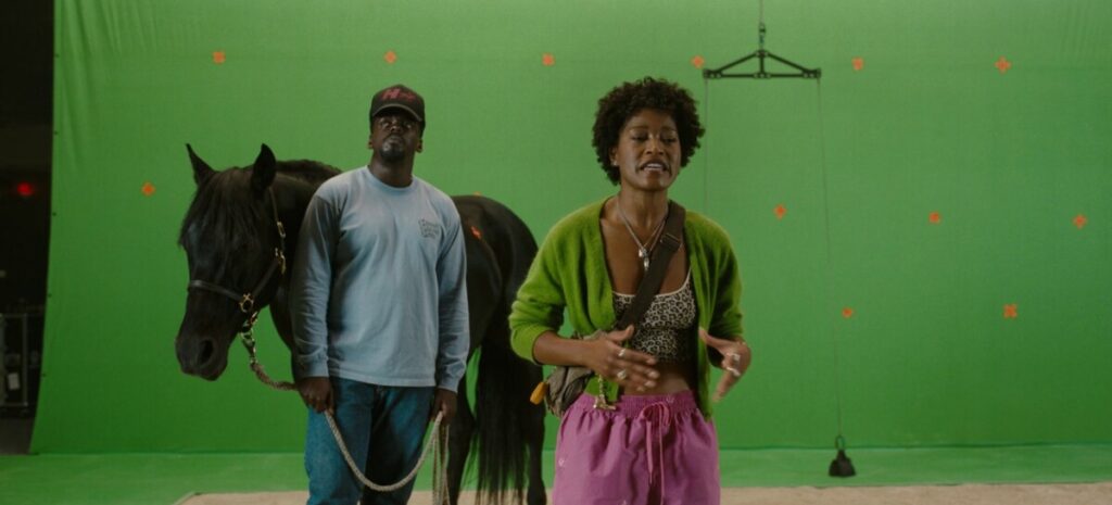 In one of the major scenes where both protagonists stand in front of a green screen, we get an early glimpse into how Black performers are often treated within the film industry. Taking into account the main characters’ family history, particularly their connection to one of the first moving pictures, featuring their great (3x) grandfather riding a horse, the crew’s reaction to their presence feels heavily anticlimactic. This moment of what seems like simple oversight, is rooted in the historical disregard of Black contributions to cinema, aligned with the siblings’ late father’s horse ranch, which serves as a foundation for the two. The way their labor and resources are used with minimal acknowledgement or recognition encapsulates the broader experience of many Black and minority group whose efforts often go unseen beyond the screen.