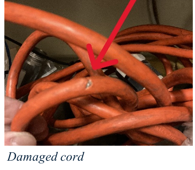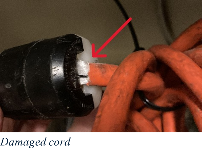 Inspect all electrical cords and power strips for DAMAGE before use. If the cord is damaged, immediately remove the cord from service, cut it up and discard – DO NOT USE IT!