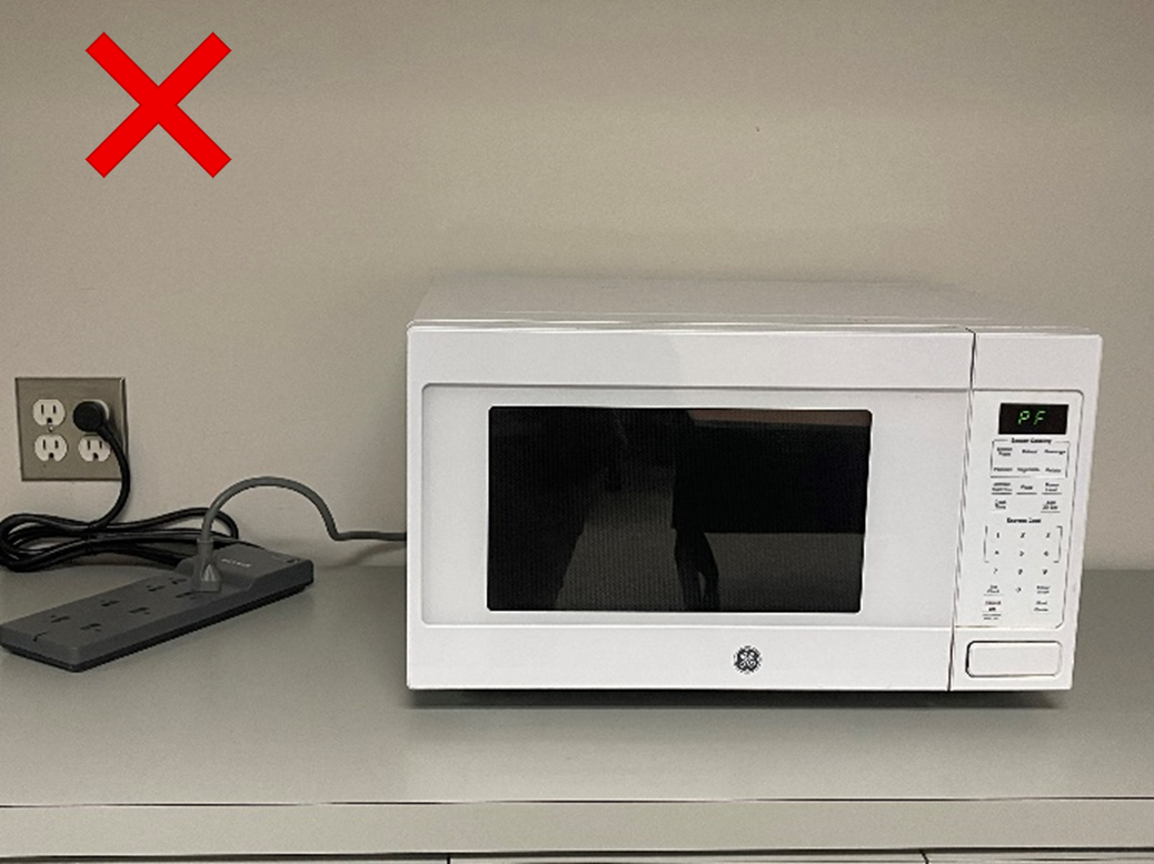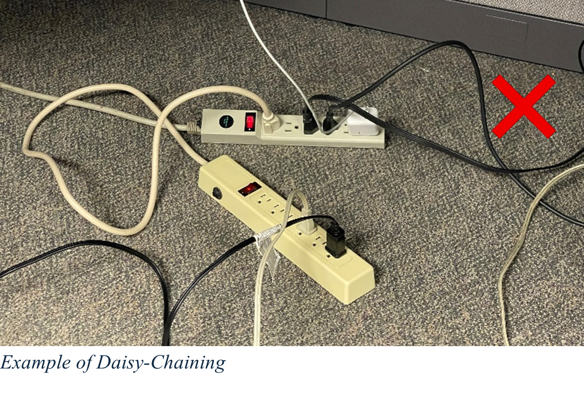 Never plug extension cords or power strips into one another. This is called “daisy-chaining” and can overload the circuit creating a potential fire hazard. Power strips and extension cords must be plugged directly into the wall outlet, and never into each other.