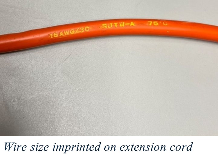 Never use an extension cord designed for household use in a laboratory or office area. EHSO recommends using extension cords with a minimum of 14-gauge wiring (14 AWG), depending on the power needs of the connected equipment. The wire size is imprinted on the cord’s surface.