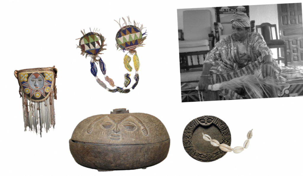 The Diviner’s Toolkit by ‘Bukunmi Bifarin is licensed under CC BY-NC-SA 4.0 and is a derivative of Divination Bowl with Lid (Link), Divination Tray, Opon Ifa (Link), Diviner’s Necklace (Link), and Diviner’s Bag, Apo Ifa (Link) in the Micheal C. Carlos Museum Collection, and an image of Prince Sola Aiyeku in Yoruba traditional royal regalia (Link), used under CC BY-NC-SA 4.0.